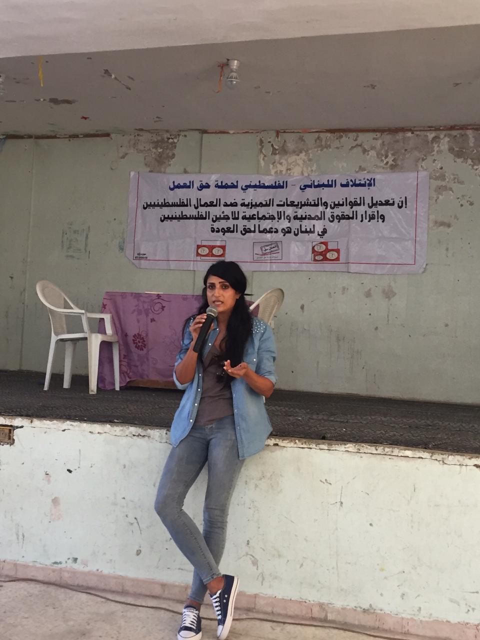 وأضافت أن اللاجىء الفلسطيني يُمنع حصريا من العمل بها مشيرة إلى أن المطالبة بحق العمل ضرورة لتحسين الواقع الإجتماعي للفلسطيني وتجنب الآفات الإجتماعية.