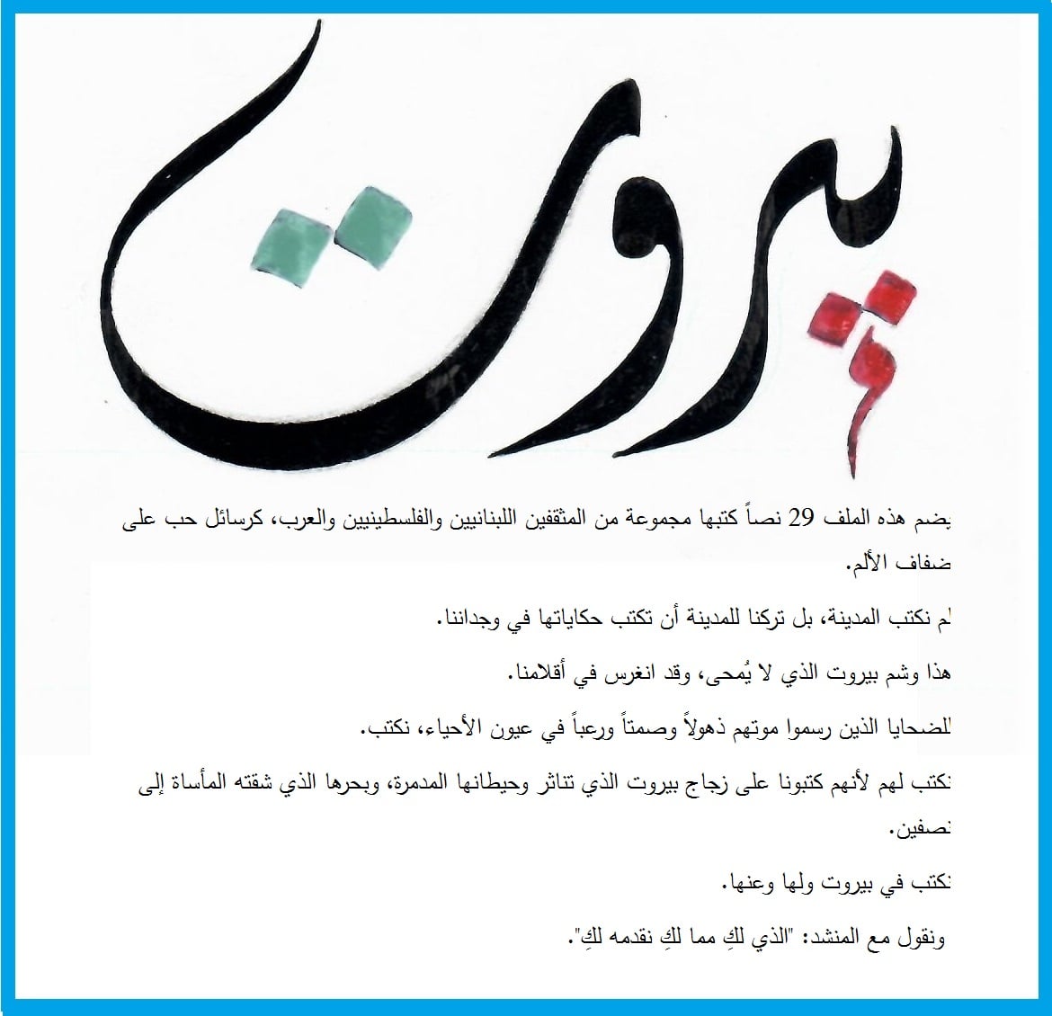 وأشار ” نكتب لهم لأنهم كتبونا على زجاج بيروت الذي تناثر وحيطانها المدمرة وبحرها الذي شقته المأساة إلى نصفين”.