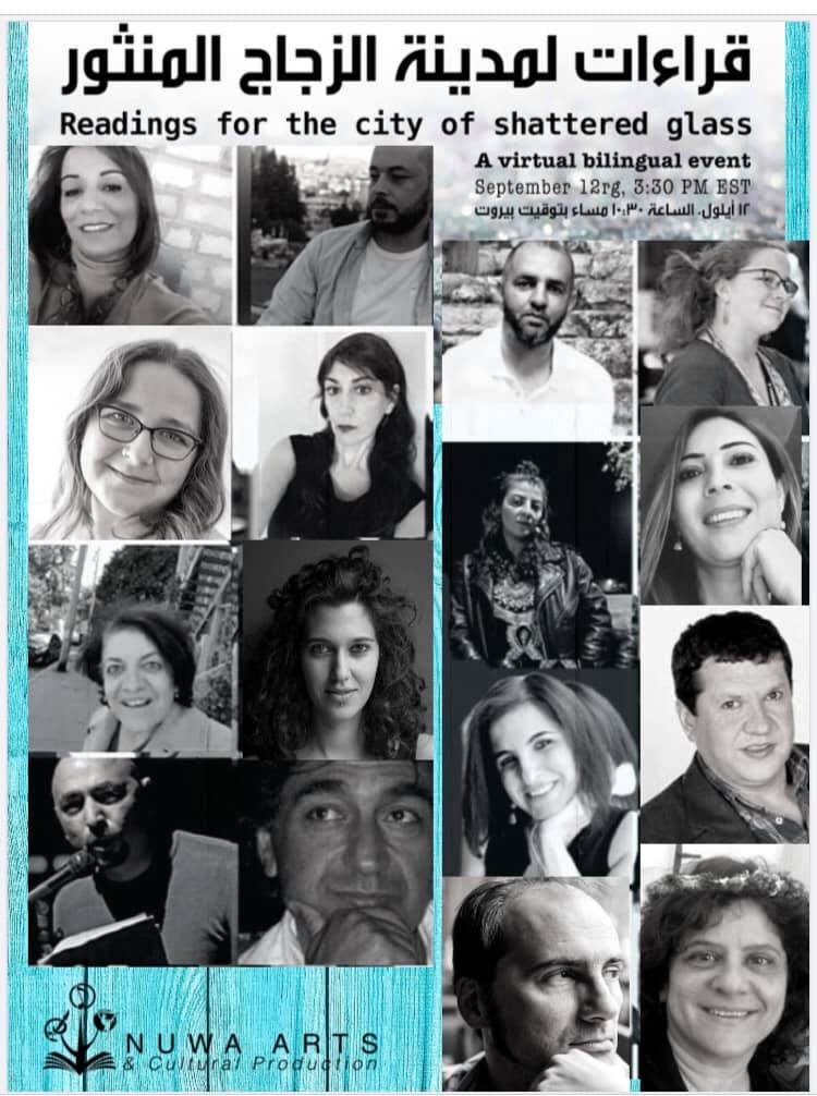 تحت عنوان “قراءات لمدینة الزجاج المنثور” تنظم مؤسسة نواة للإنتاج الثقافي والفني لقاء إفتراضيا لكاتبات وكتاب حول إنفجار الرابع من آب في العاصمة اللبنانية بيروت.