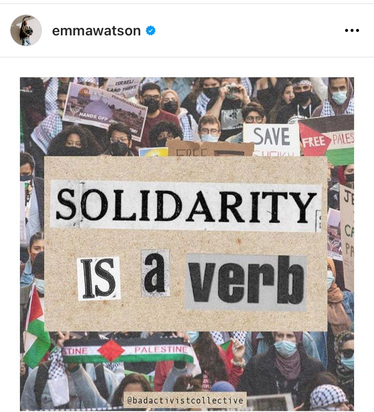 ونشرت واتسون على صفحتها على إنستغرام عبارة “التضامن هو فعل” لتنضم بذلك إلى قائمة المشاهير المؤيدين للشعب الفلسطيني.